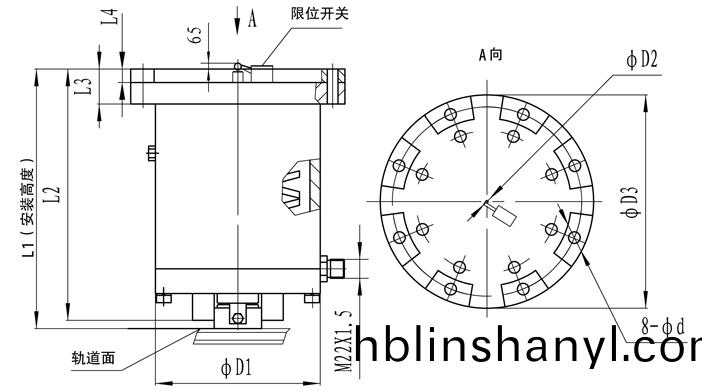 型號 | 額定頂軌力(KN) | 額定靜摩擦阻力(KN) | 油缸工作壓力(MPa) | 開閘油量(L) | 有傚行程 | 安裝高度L1 | L2 | L3 | L4 | D1 | D2 | D3 | d | 重量(kg) |
